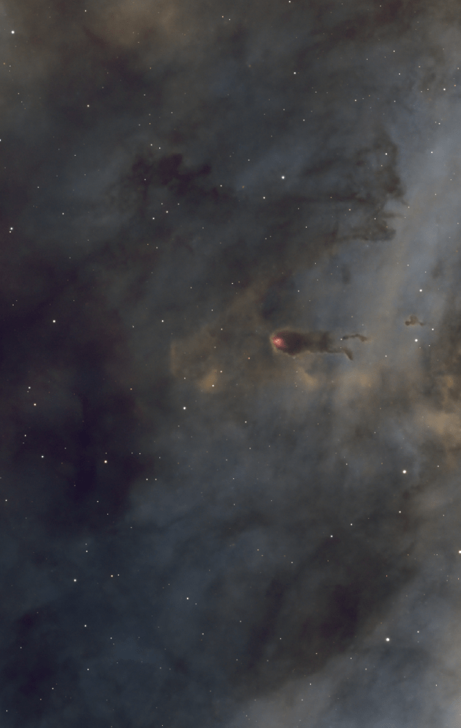 Un objeto que ha captado mi atención es una pequeña nube de polvo y gas donde se puede ver una estrella muy rojiza. En realidad, es lo que se llama un objeto YSO (Young Stellar Objects). Estos objetos estelares jóvenes aún en proceso de formación, son protoestrellas envueltas en material de acreción, que evolucionan desde densas nubes de gas y polvo hasta convertirse en estrellas estables en la secuencia principal. Se observa aún la nube de polvo que la rodea y que poco a poco se ira disolviendo debido a la gran emisión de radiación de la joven estrella. Lo más curioso es su forma, que recuerda a un Minion, lo que le da un aire enigmático y fascinante. Este objeto se encuentra hacia la mitad, cerca del lado derecho de la imagen.